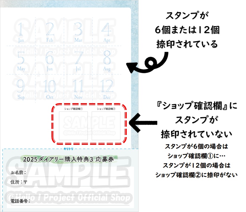 ・「ショップ確認欄」に特典写真交換スタンプが捺印されていない(特典写真交換スタンプが6個の場合はショップ確認欄①・12個の場合はショップ確認欄②)
